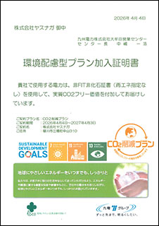 当社ではカーボンニュートラルを目指して、2025年4月より工場で使用する電力については、九州電力㈱と契約し、実質CO2フリー電力を供給してもらっています。そのため電気の年間CO2排出推定量約290,000㎏(前年度実績)が、今期はほぼ0㎏となります。