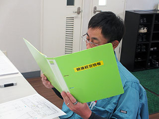 社員に健康に関する情報を周知するために、2024年10月から「健康経営ファイル」を使って全社員に回覧しています。回覧する内容は、「睡眠」「熱中症」「マイナ保険証」など、社員が受講した研修会の内容や協会けんぽからのお知らせなど多種多様に及びます。回覧後は自身の押印欄に押印してもらうことで、回覧漏れがないようにしています。