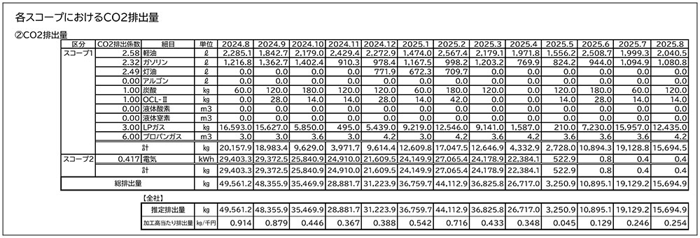 前述の通り、実質CO2フリー電力を導入したために、2025年8月度の加工高当たり排出量は、推定0.254㎏/千円と、前年同月の0.914㎏/千円から大きく削減することができました。